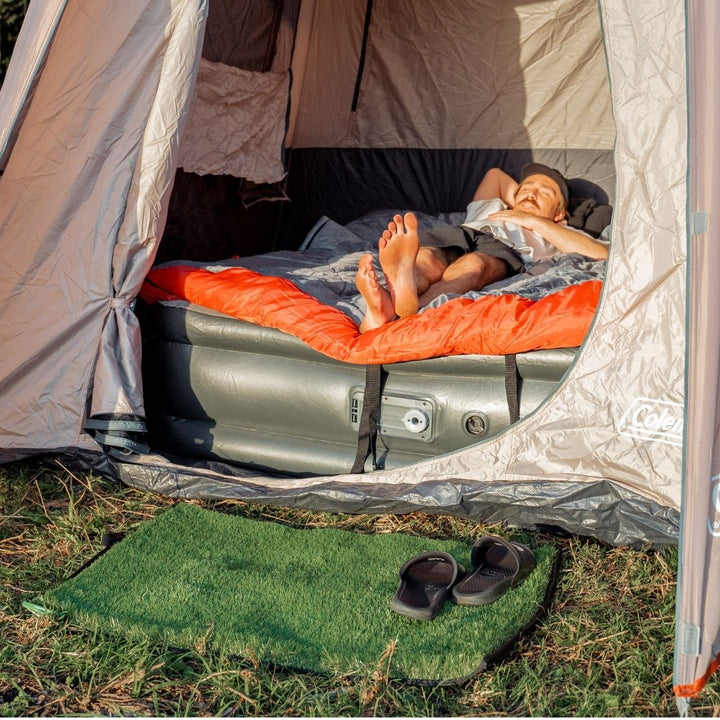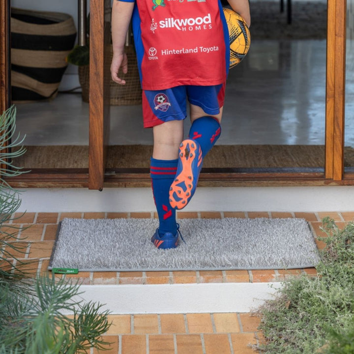 TRIP OR SLIP HAZARD: All mats and floor rugs can have the opportunity to be a trip or slip hazard. muk mat blades are made from recycled plastics, and plastic does have the potential to be slippery, especially when wet. Please take care and ensure you minimise the risk of falls by securely fastening your mat and or using a non-slip mesh underneath. When using caravan stairs, risks of falls or slips can be reduced by ascending and descending slowly and holding onto a steady object.